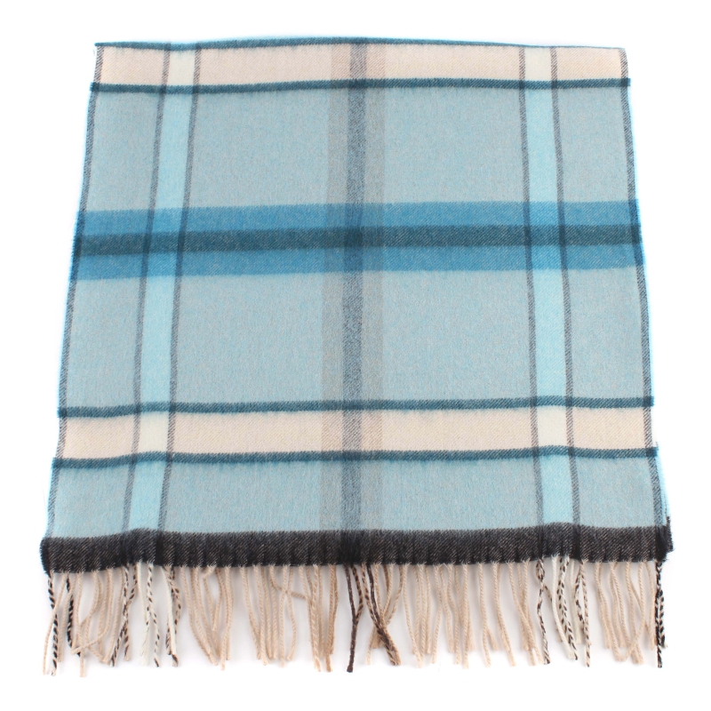 Large woolen fluffy and warm scarf in turquoise and light beige check.
