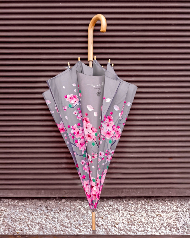 Design: An elegant umbrella in soft tones, bringing vitality and a springtime atmosphere among colorful trees, fresh air, and blooming flowers.