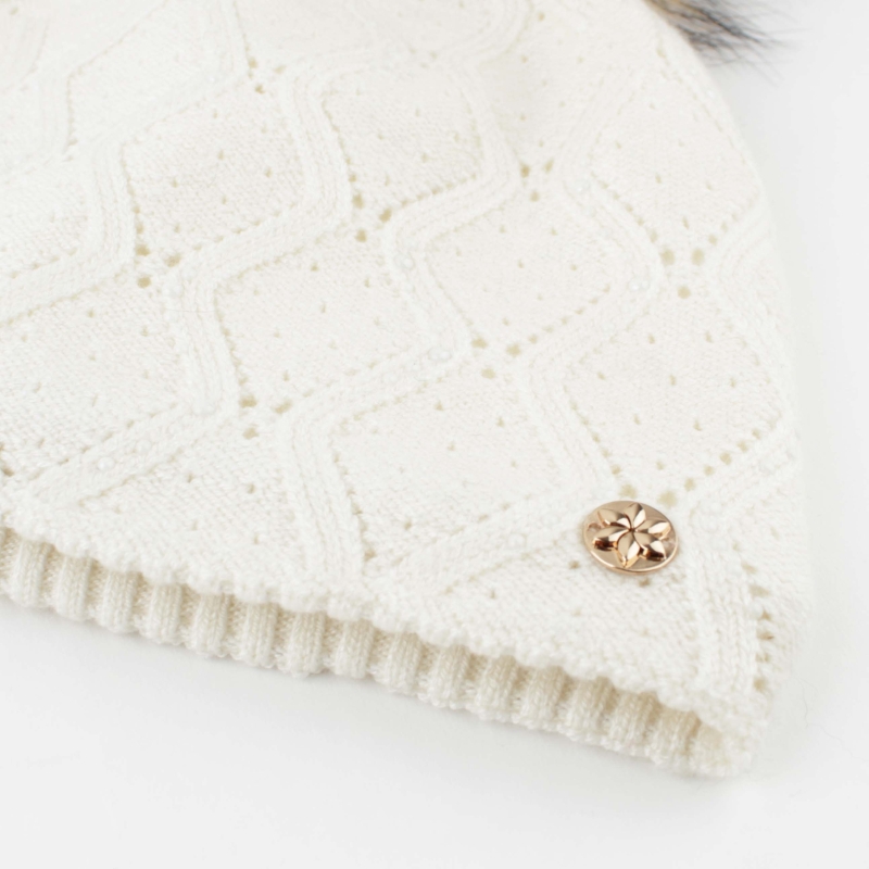 Ladies' knitted hat in ecru with fluffy natural pompom, beautiful textured knit, and metallic stud decorations.