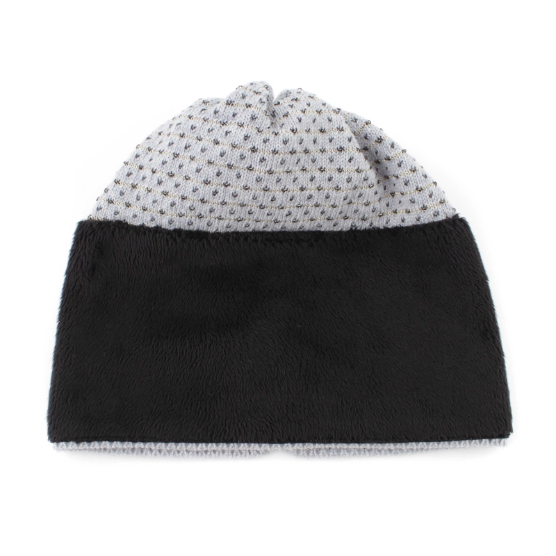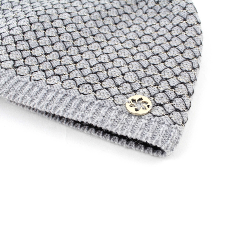 Ladies' knitted hat in grey, decorated with black mesh, golden threads, and a natural fur pompom.