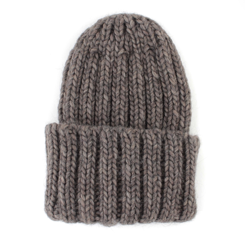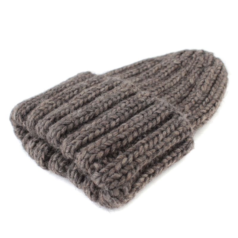 Comfortable knitted winter hat with a chunky elastic rib pattern and soft, voluminous yarn.