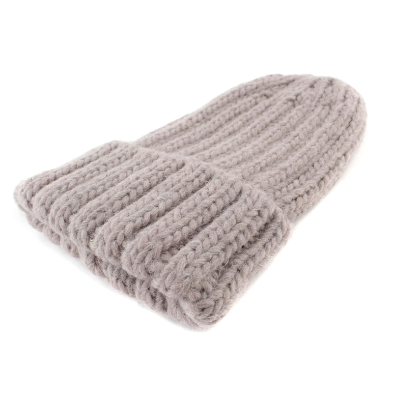Comfortable knitted winter hat with a chunky elastic rib pattern and soft, voluminous yarn.