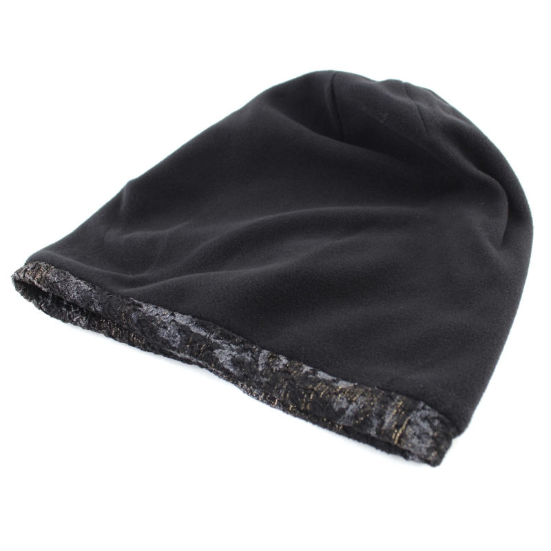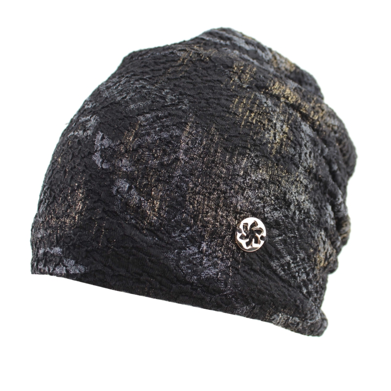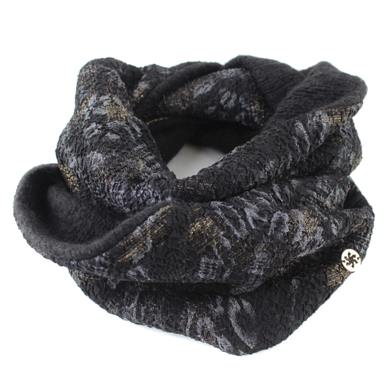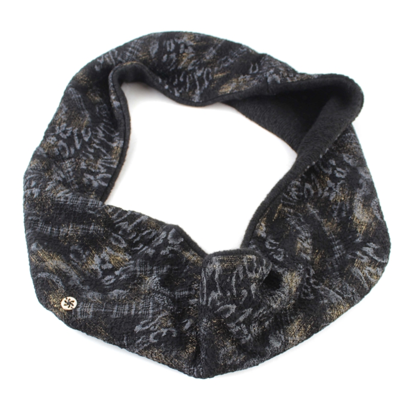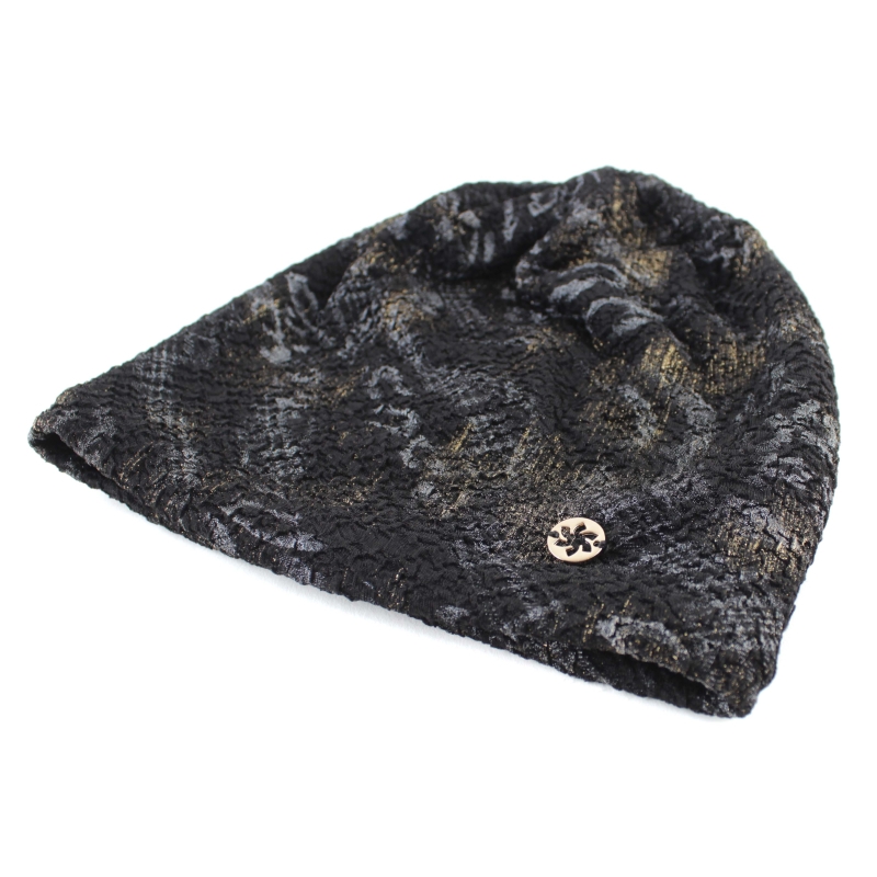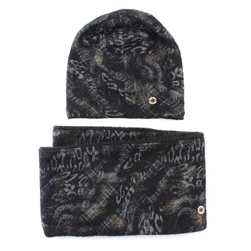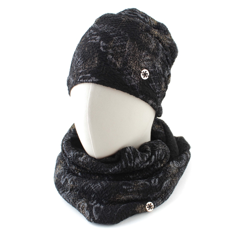 Ladies' hat and infinity scarf set in black with abstract animal pattern in gold and silver.