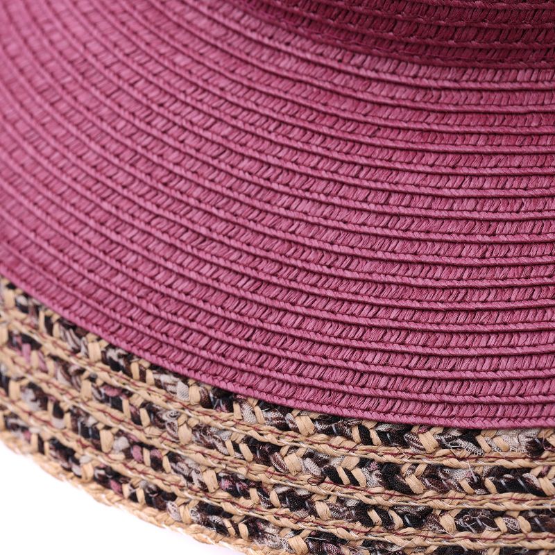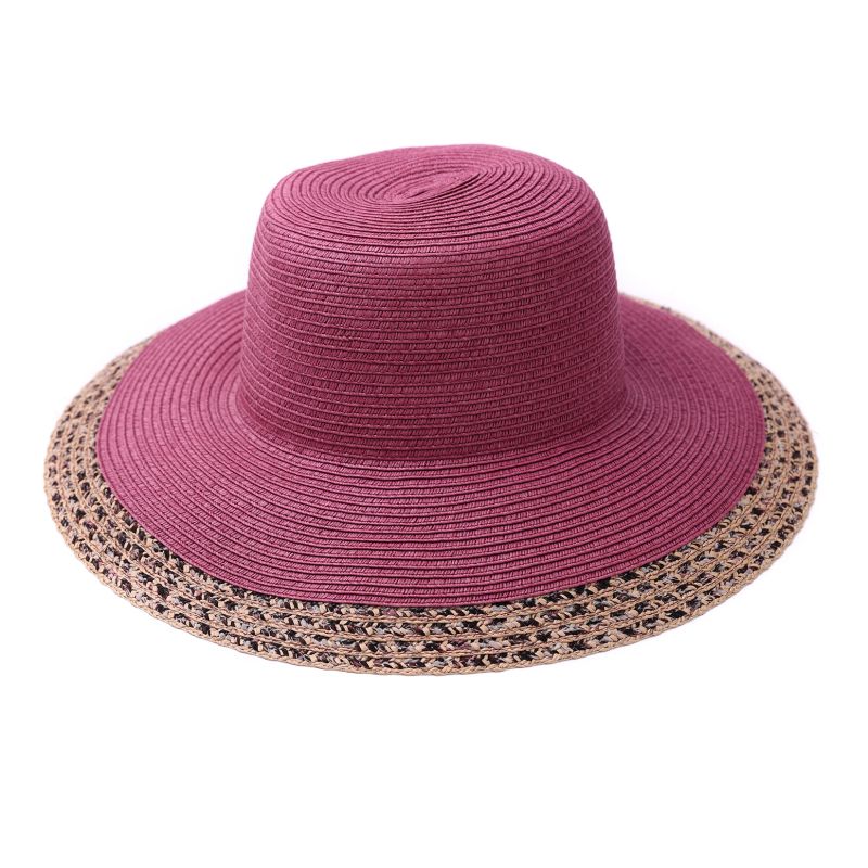 Women’s summer wide-brim hat (10 cm) in a deep pink shade with a wine undertone, featuring a melange trim made of woven textile fibers. Lightweight and comfortable model.