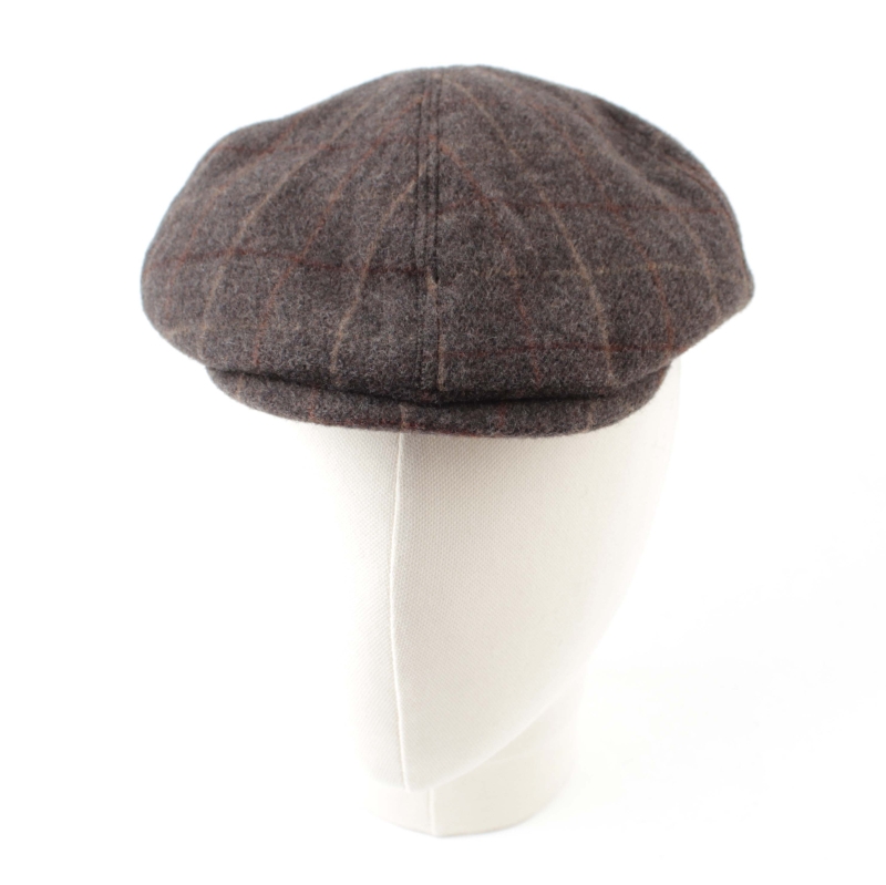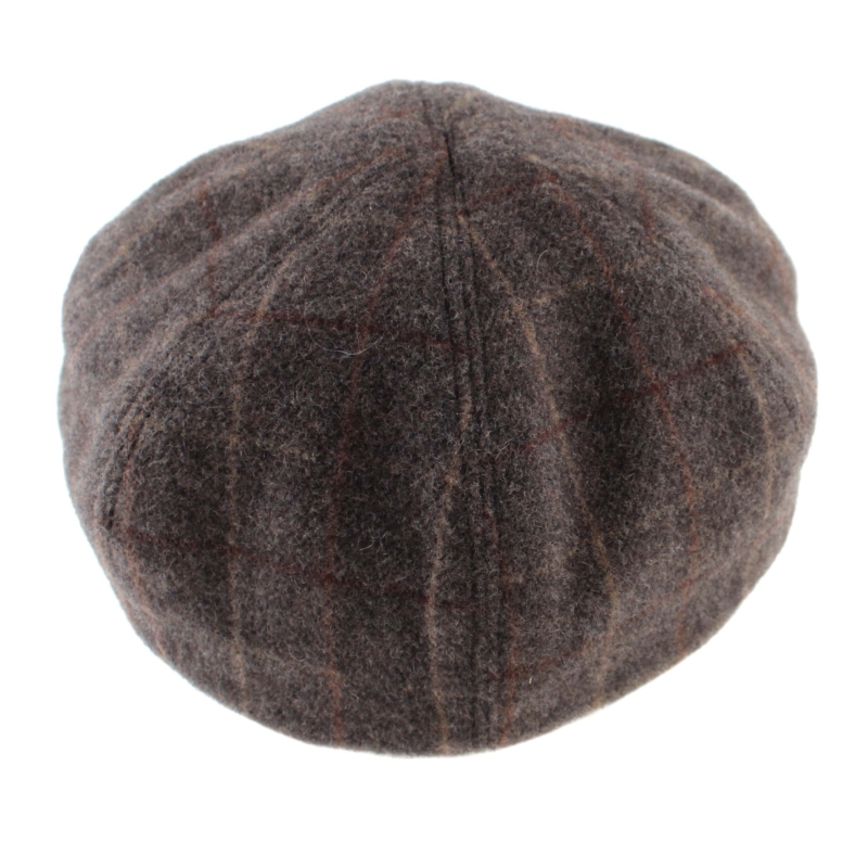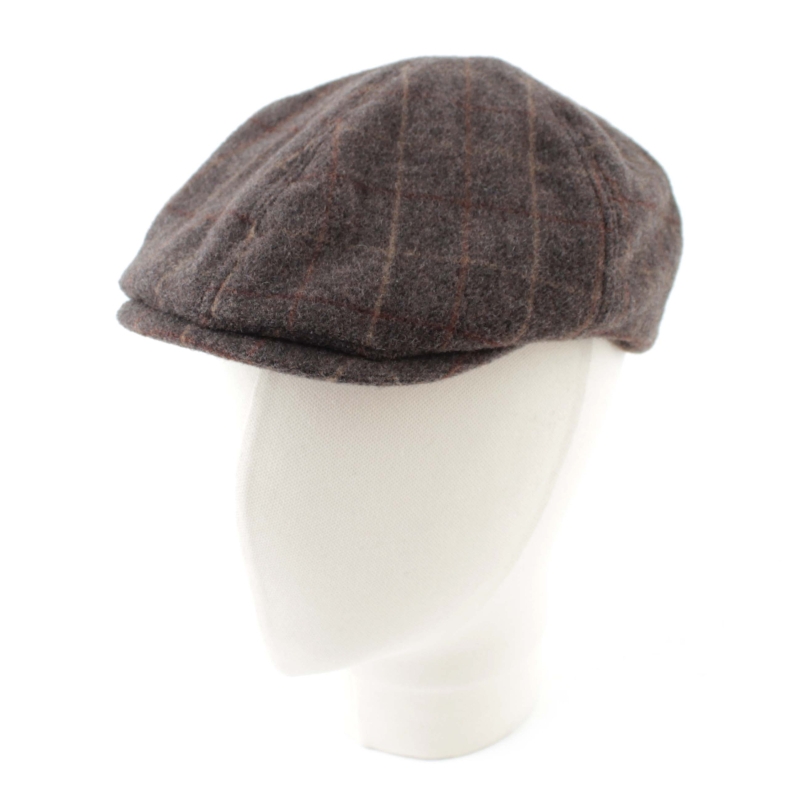 Men’s flat cap made from a wool-blend fabric in brown check pattern.