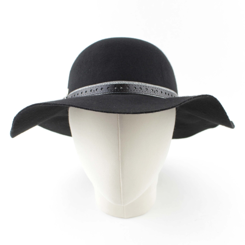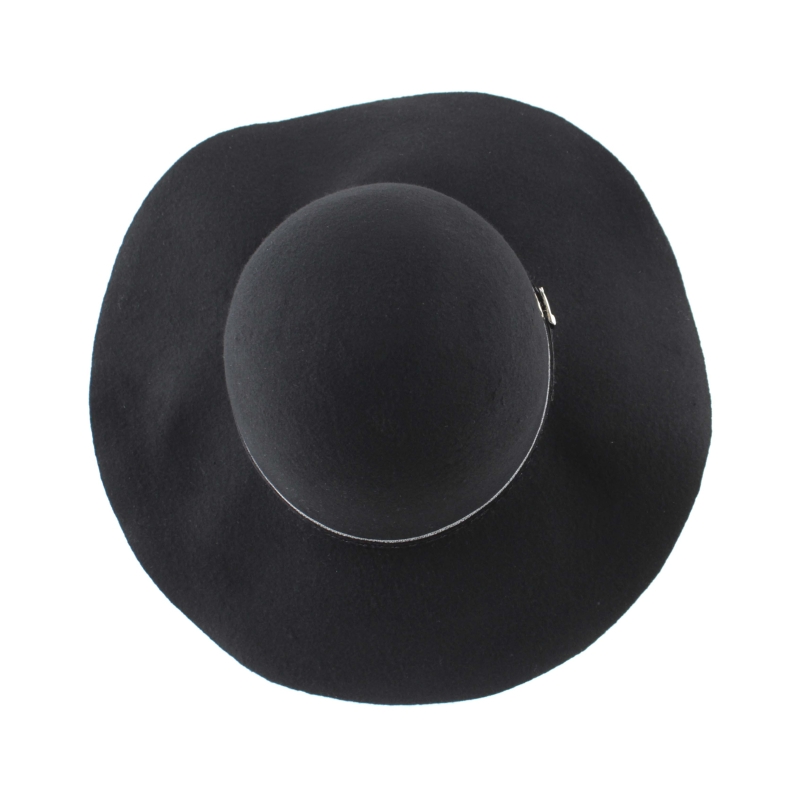 Черна широкопола филцова шапка с декоративна лента в черно и сребристо.