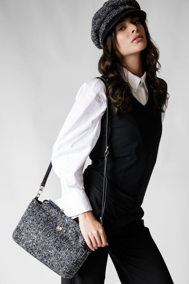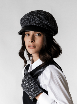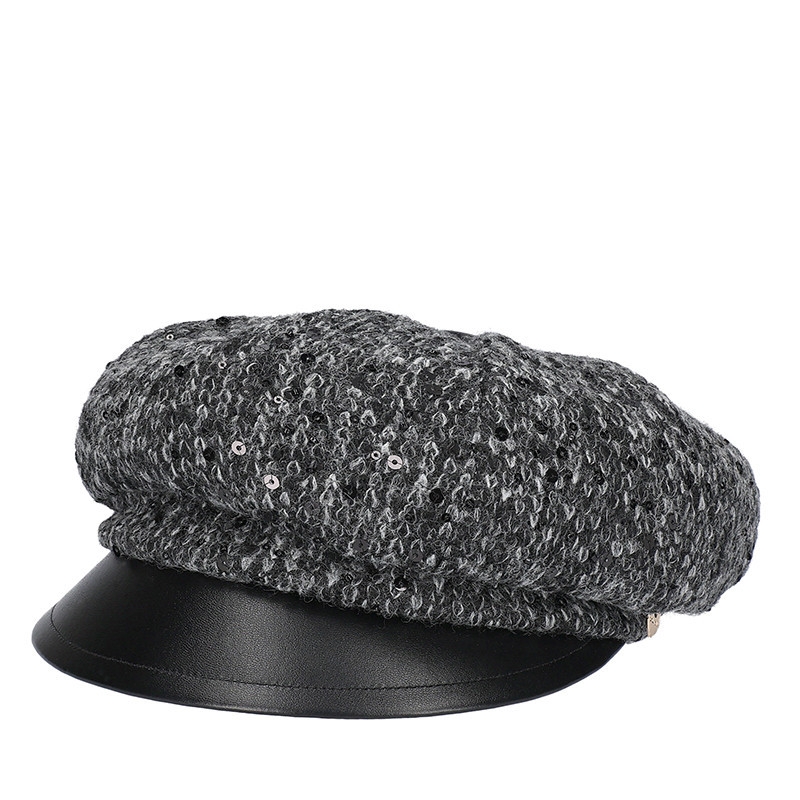 Дамски зимен каскет от плат тип букле в черно-сив меланж с декорация от малки мъниста и пайети.