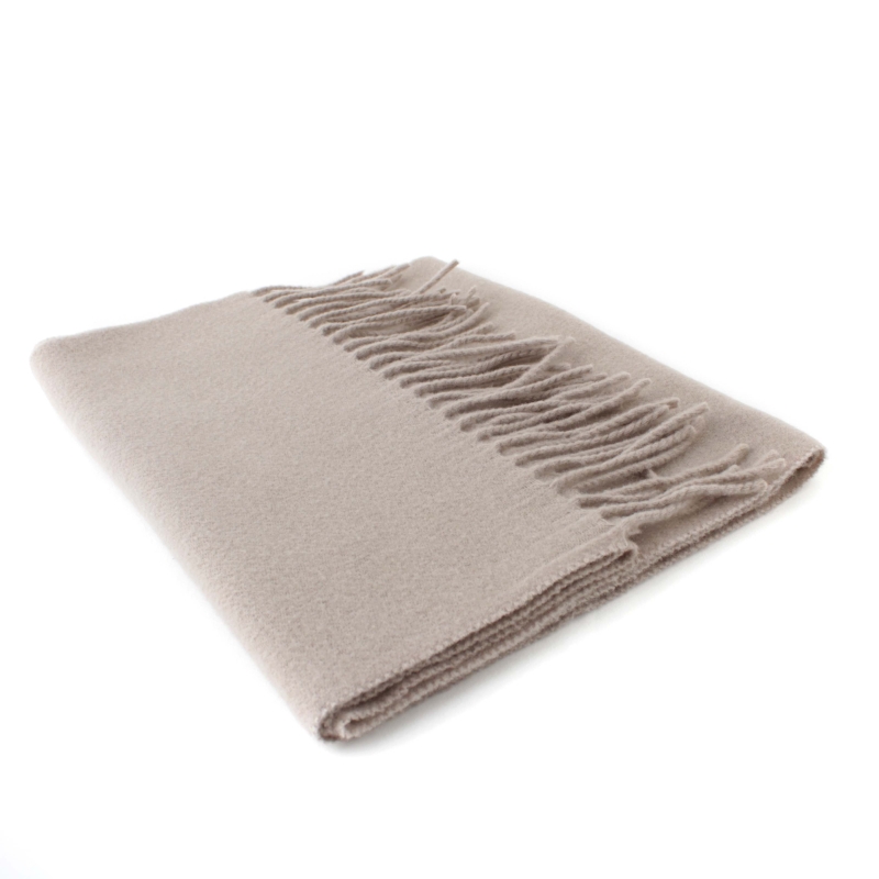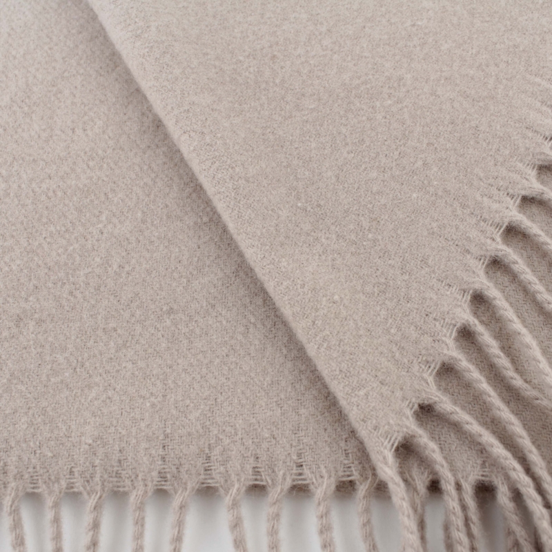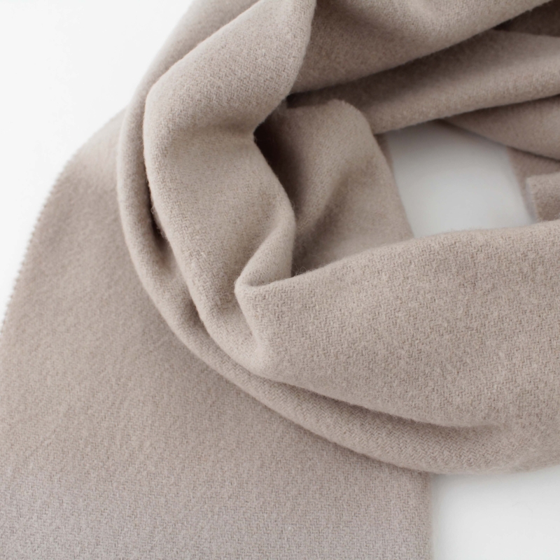 Едноцветен топъл шал от кардиран вълнен плат в бежово.