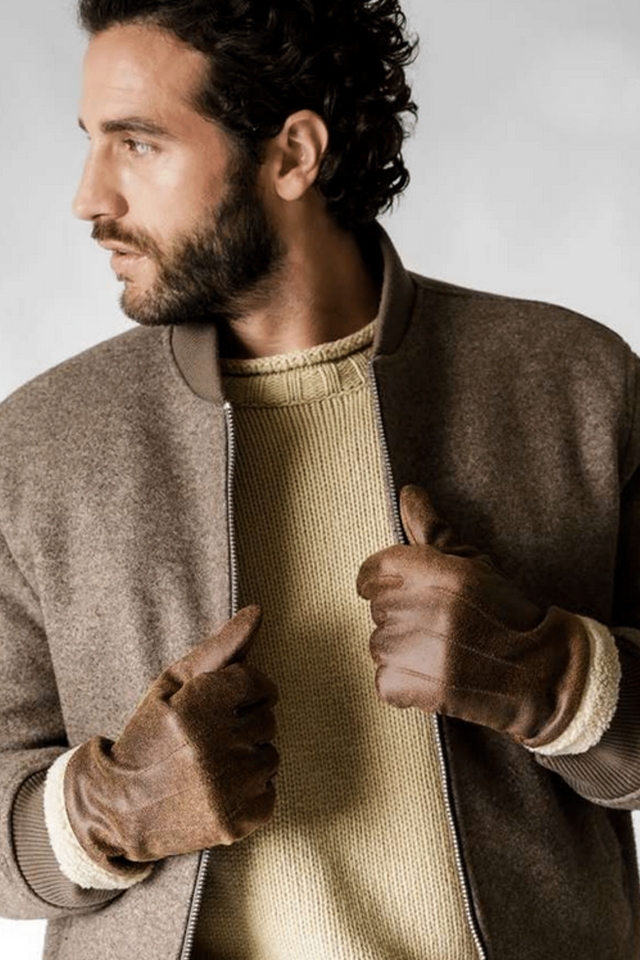 Мъжки ръкавици имитация на агнешка кожа с пухкав маншет.
