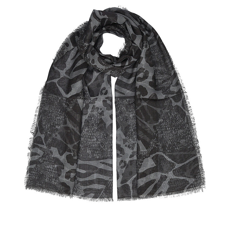 Голям шал от бамбукова вискоза с животински мотив в сиво и черно.