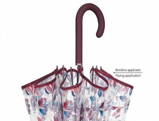 Дамски несгъваем автоматичен чадър от линията Perletti Time с прозрачен купол и мотив листа в бордо и тюркоаз.