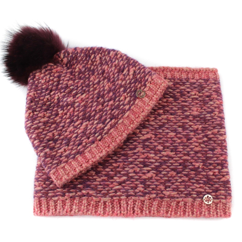 Комплект дамска плетена шапка с помпон и кръгъл шал от мека обемна прежда в розово-лилав меланж.