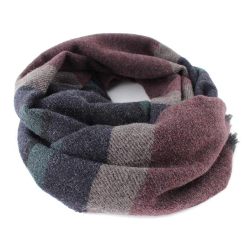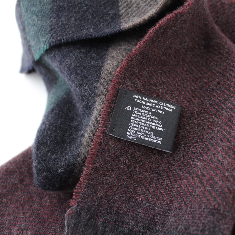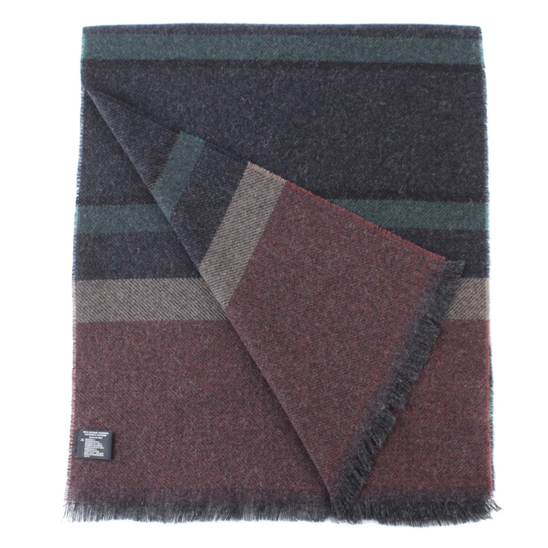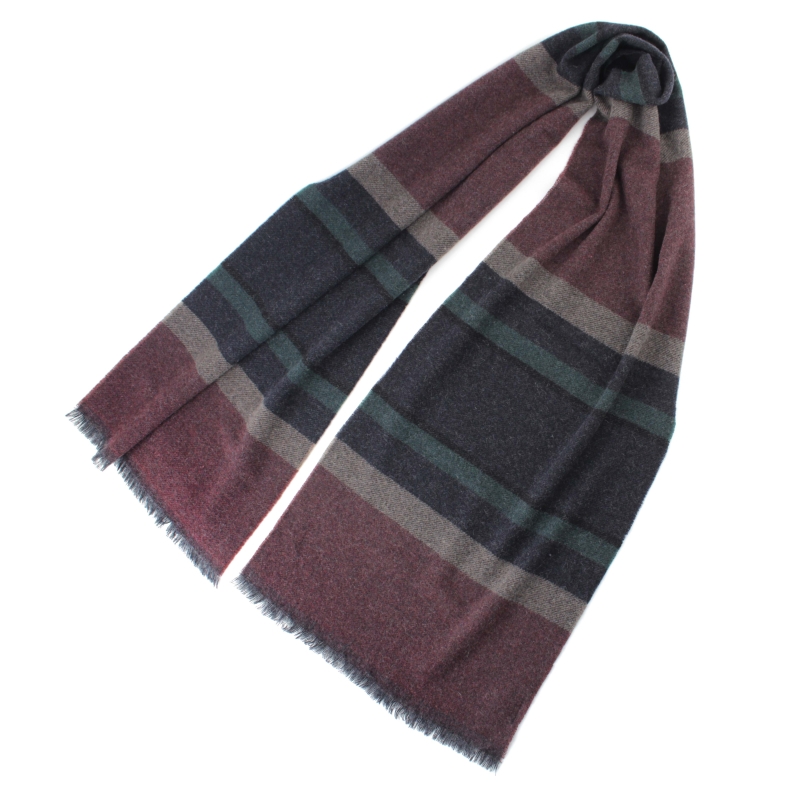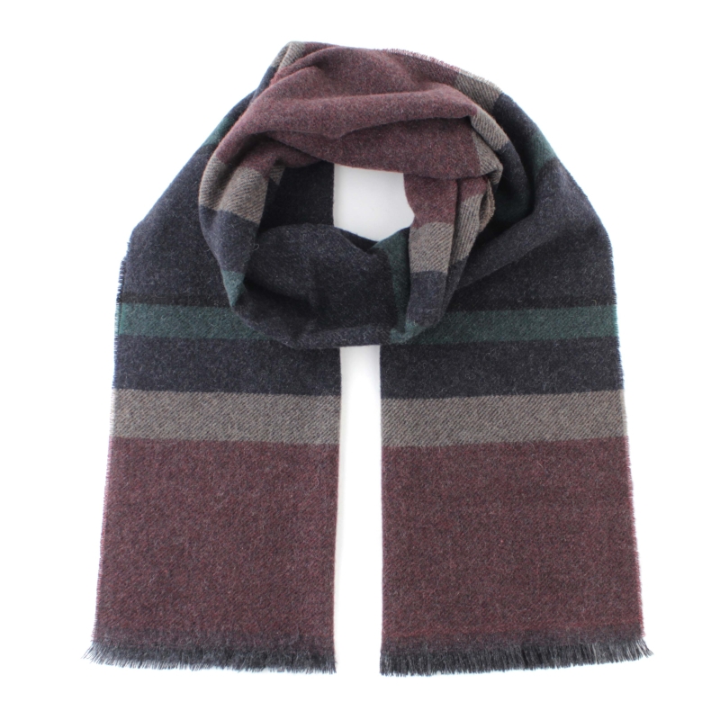 Фин кашмирен шал на райета в бордо, тъмносиньо и синьо-зелено.