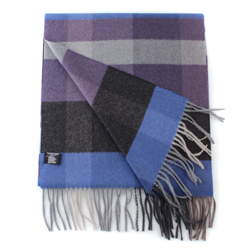 Мек и топъл зимен вълнен шал от фина вълна в синьо-лилаво каре.