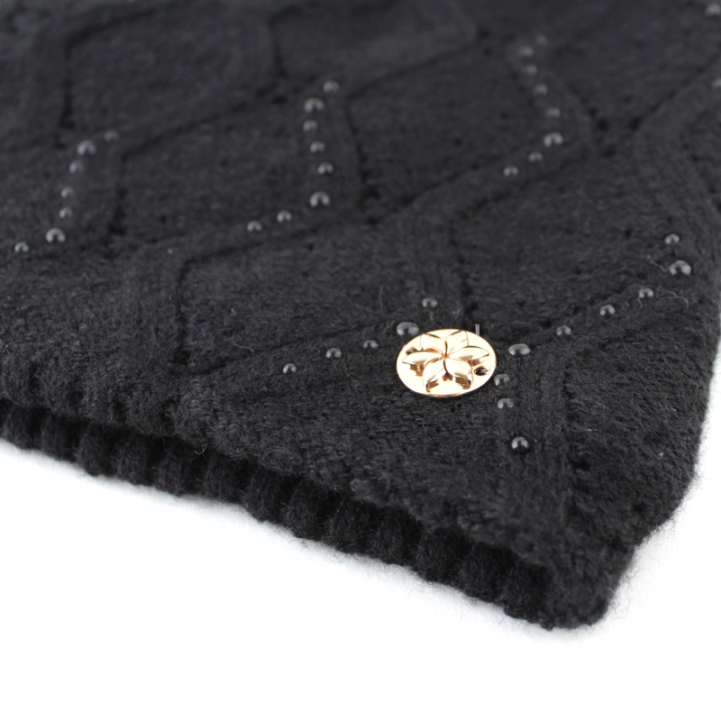 Дамска зимна плетена шапка с помпон в черно, с релефна плетка и декорация от метални капси. Моделът е с мека топла подплата по цялата дължина и приляга по главата, без да стои обемно. Подходяща за студено зимно време както в града, така и в планината.