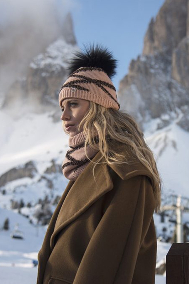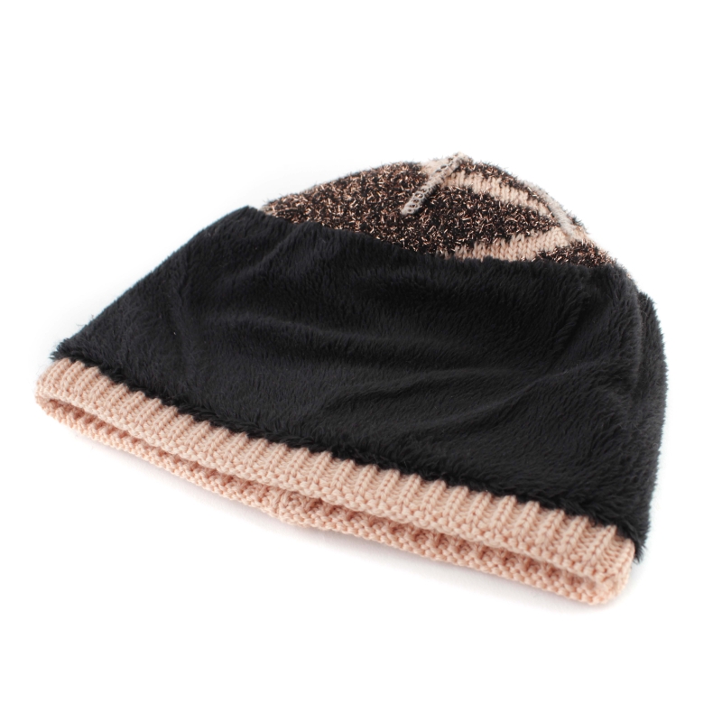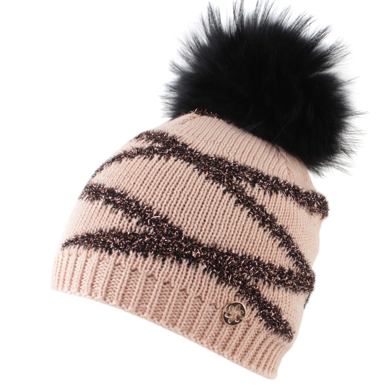 Дамска зимна плетена шапка с естествен помпон в пастелнорозово, с гладка плетка и декорация от блестящи бронзови метални нишки. Моделът е с мека топла подплата в областта на челото и приляга по главата, без да стои обемно. Подходяща за студено зимно време както в града, така и в планината.