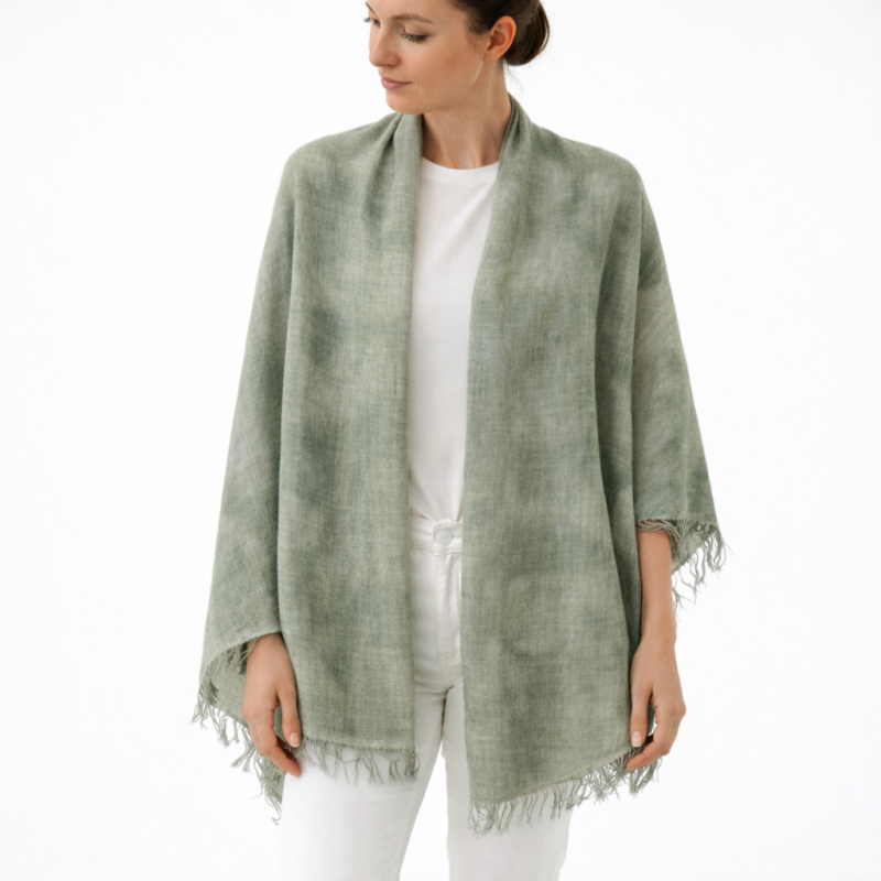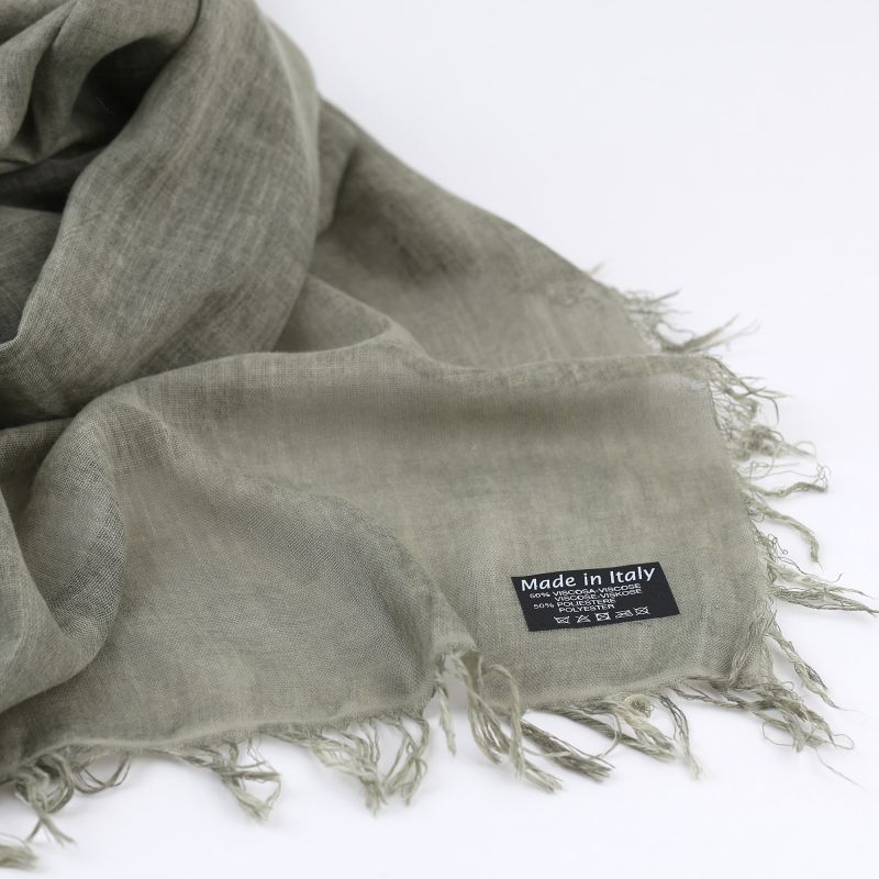Голям шал от вискоза и полиамид в мек маслинено-зелен нюанс със сив подтон и приглушен, „изпран“ ефект, с лека и приятна на допир материя. Фин и удобен за носене, подходящ за различни сезони и лесен за комбиниране в ежедневието.