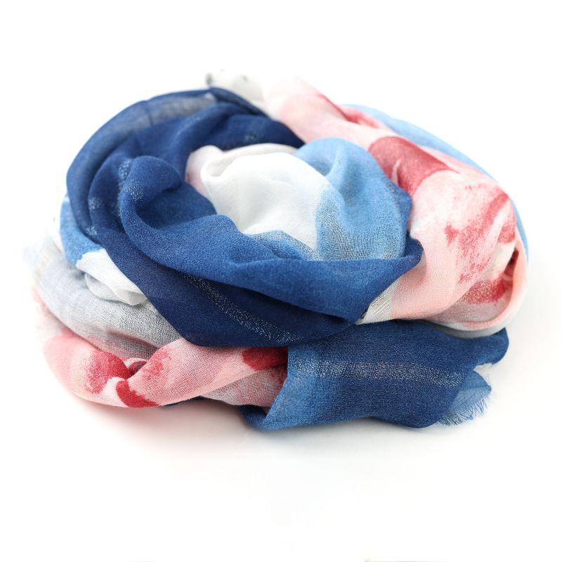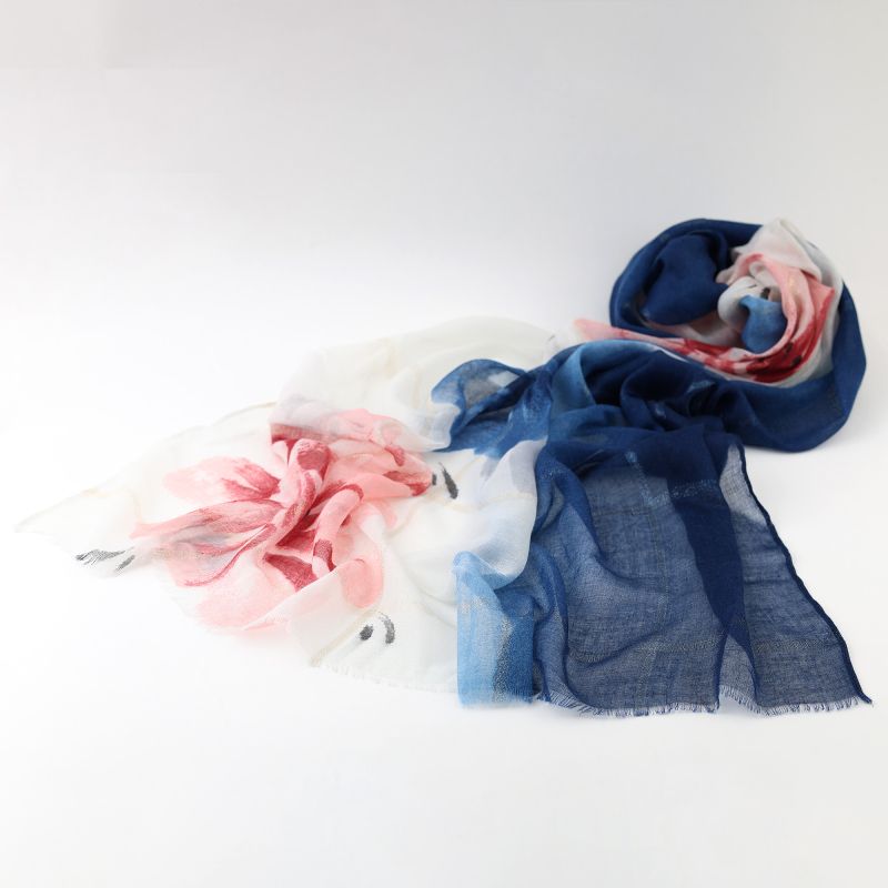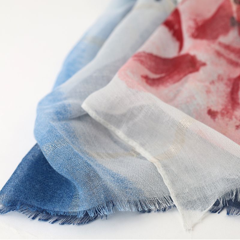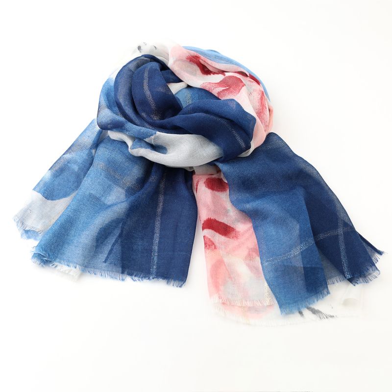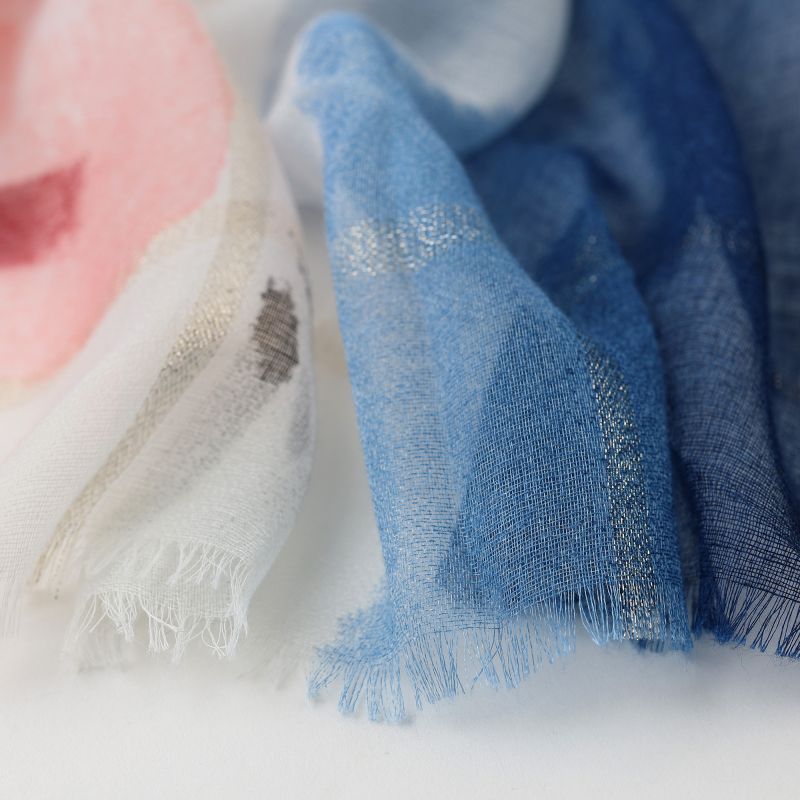 Дамски летен шал от фина прозрачна материя с акварелни флорални мотиви и преливащи се сини тонове, комбинирани със златисти линии. Материята е лека, прозирна и приятна на допир. Шалът е подходящ за топлите месеци и може да се носи около врата или като наметка.