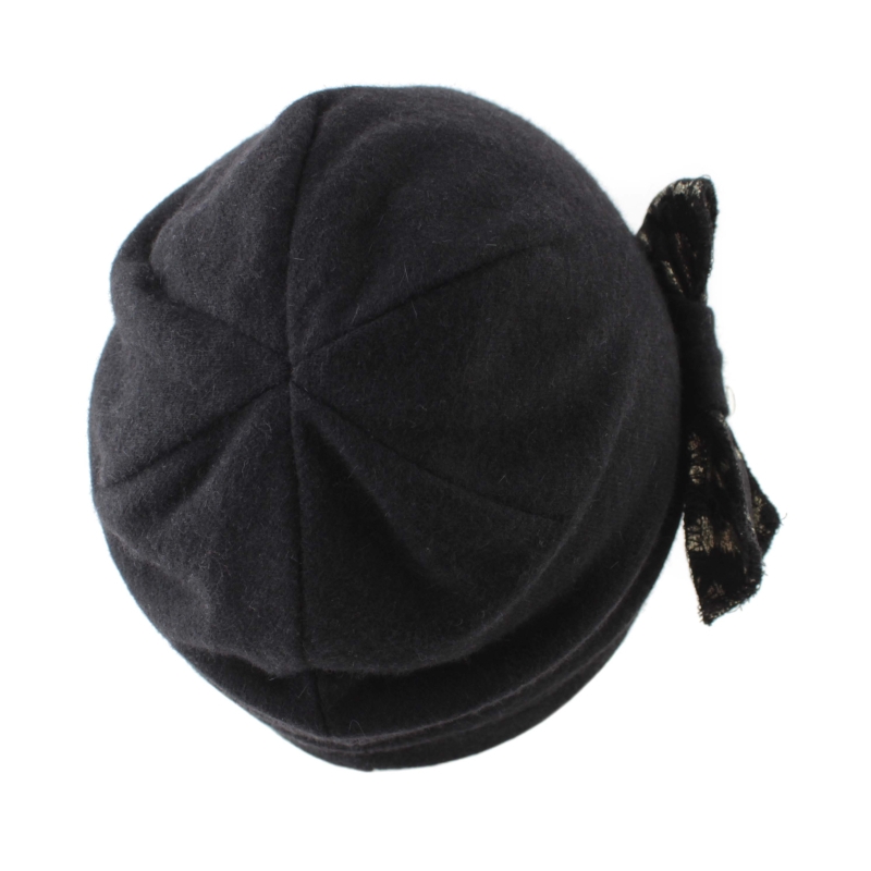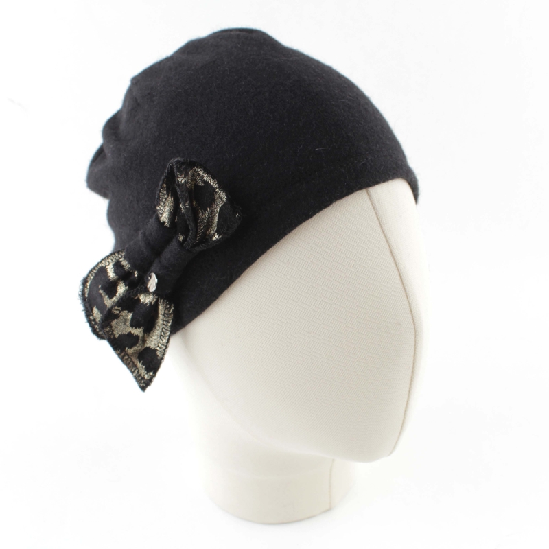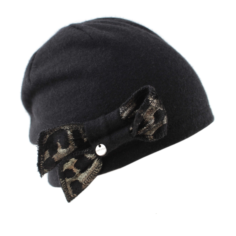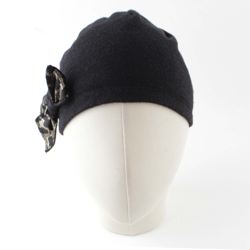 Топла вълнена малка дамска шапка с декорация от златиста панделка с леопардов мотив.