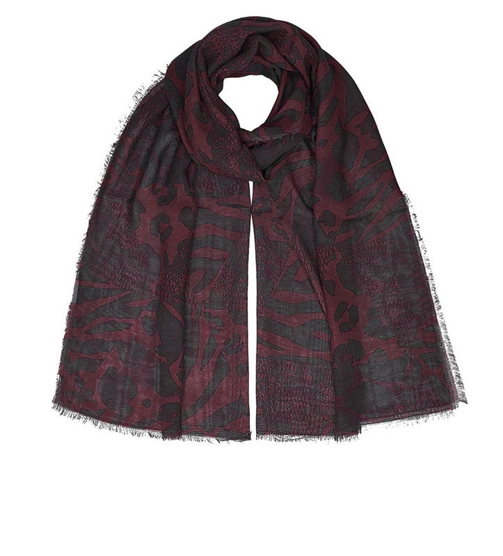 Eșarfă mare din vâscoză de bambus cu motiv animal print în bordo și negru