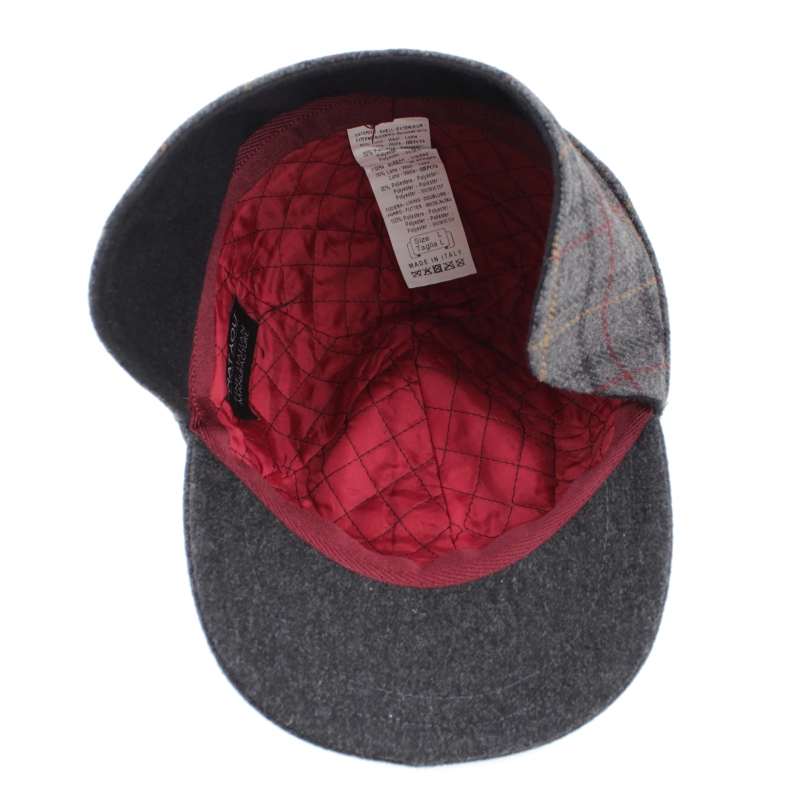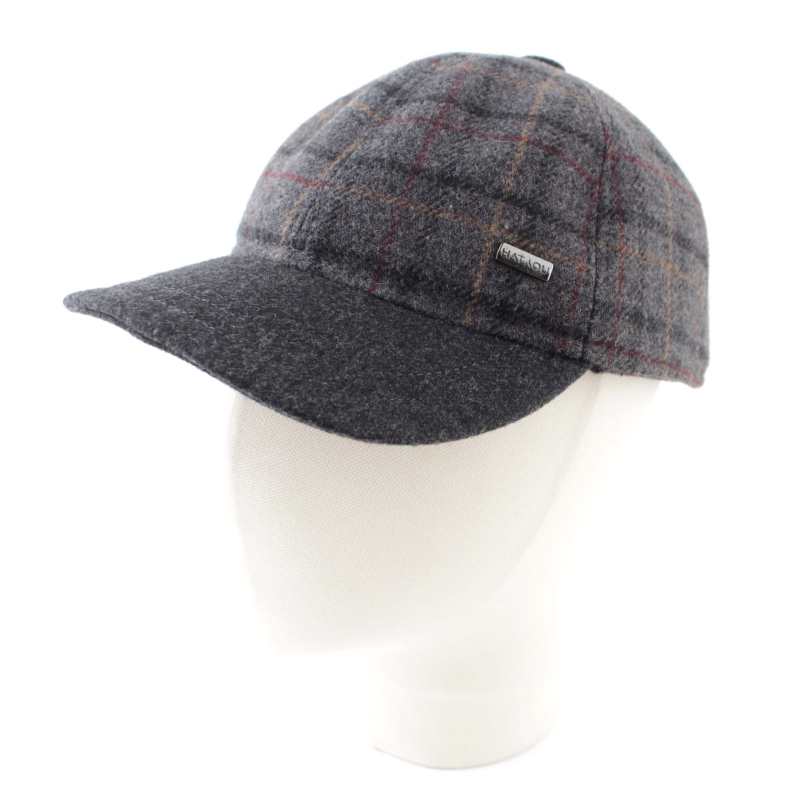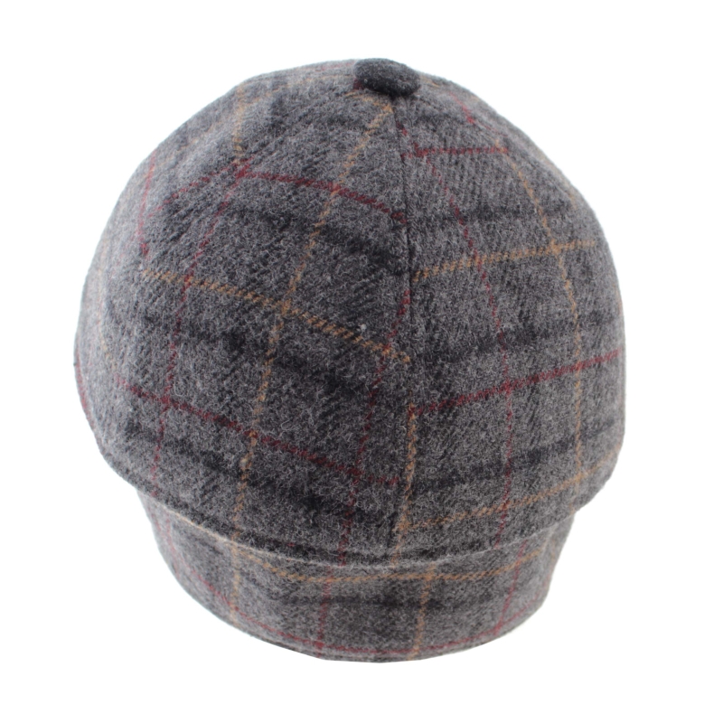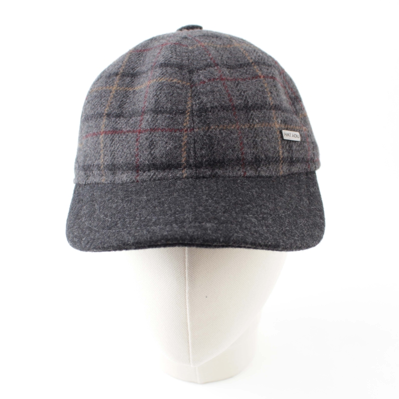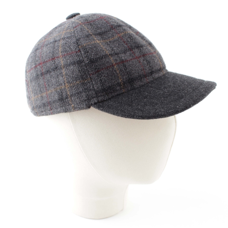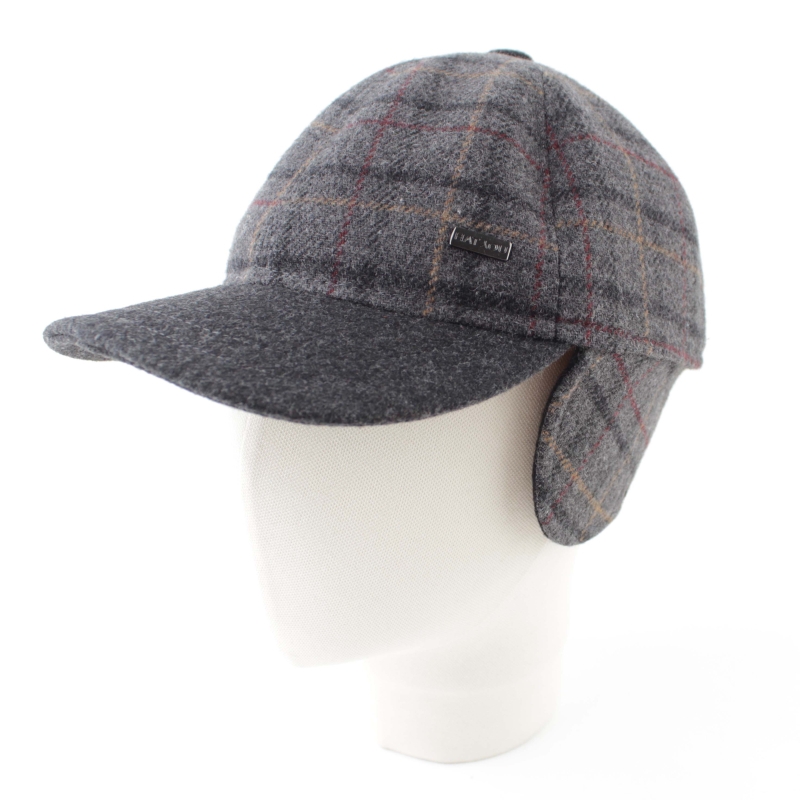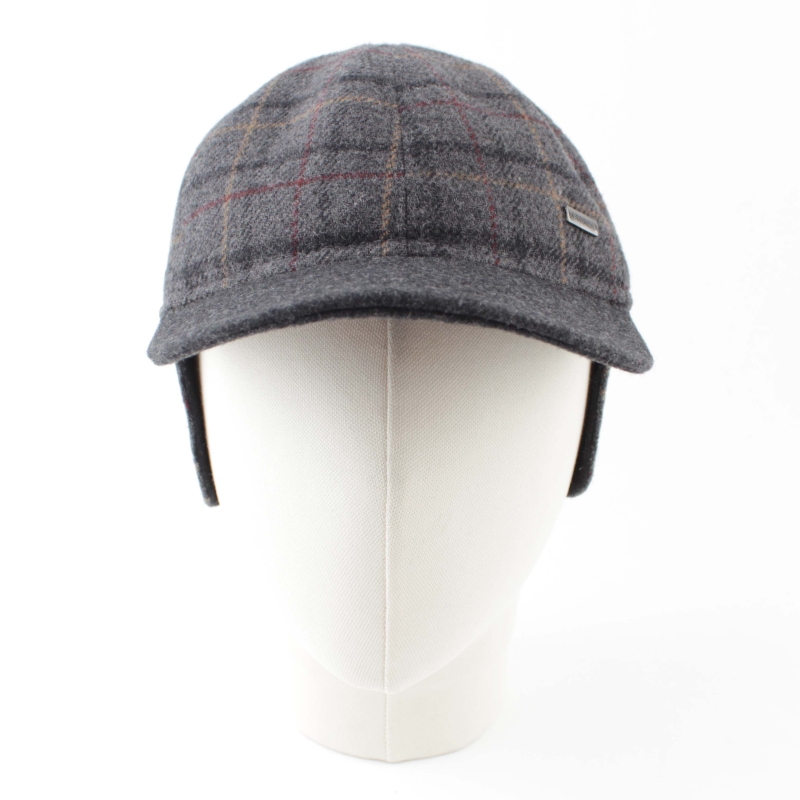 Șapcă bărbătească tip baseball din lână, cu protecție pentru urechi, în carouri gri închis.
