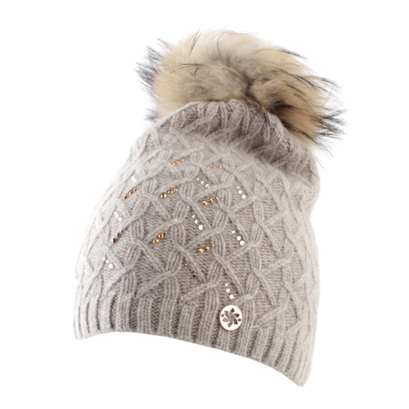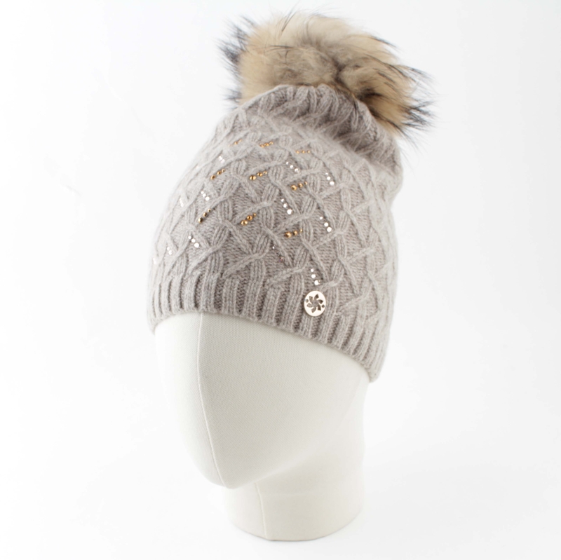 Pălărie de lux tricotată pentru femei, decorată cu pietre Swarovski și un pompon din păr natural. Pălărie de lână frumoasă - țesătură moale și delicată, pietre strălucitoare și pompa ei o transformă într-o adevărată bijuterie. Pomponul are un buton tic-tac și poate fi îndepărtat și pus. Modelul pălăriei este pe cap, iar pomponul nu cade în jos.