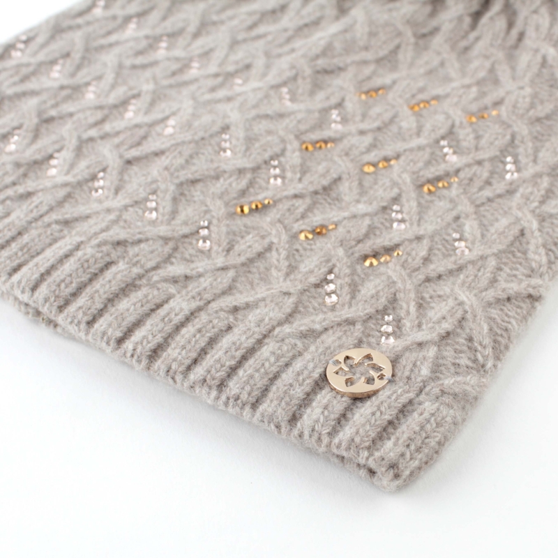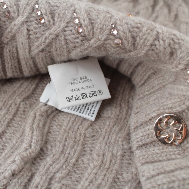 Pălărie de lux tricotată pentru femei, decorată cu pietre Swarovski și un pompon din păr natural. Pălărie de lână frumoasă - țesătură moale și delicată, pietre strălucitoare și pompa ei o transformă într-o adevărată bijuterie. Pomponul are un buton tic-tac și poate fi îndepărtat și pus. Modelul pălăriei este pe cap, iar pomponul nu cade în jos. Compoziție: 70% lână, 30% caşmir. Decor - cristale Swarovski. Pompon - păr 100% natural / Nyctereutes procyonoides /. Fabricat in Italia.
