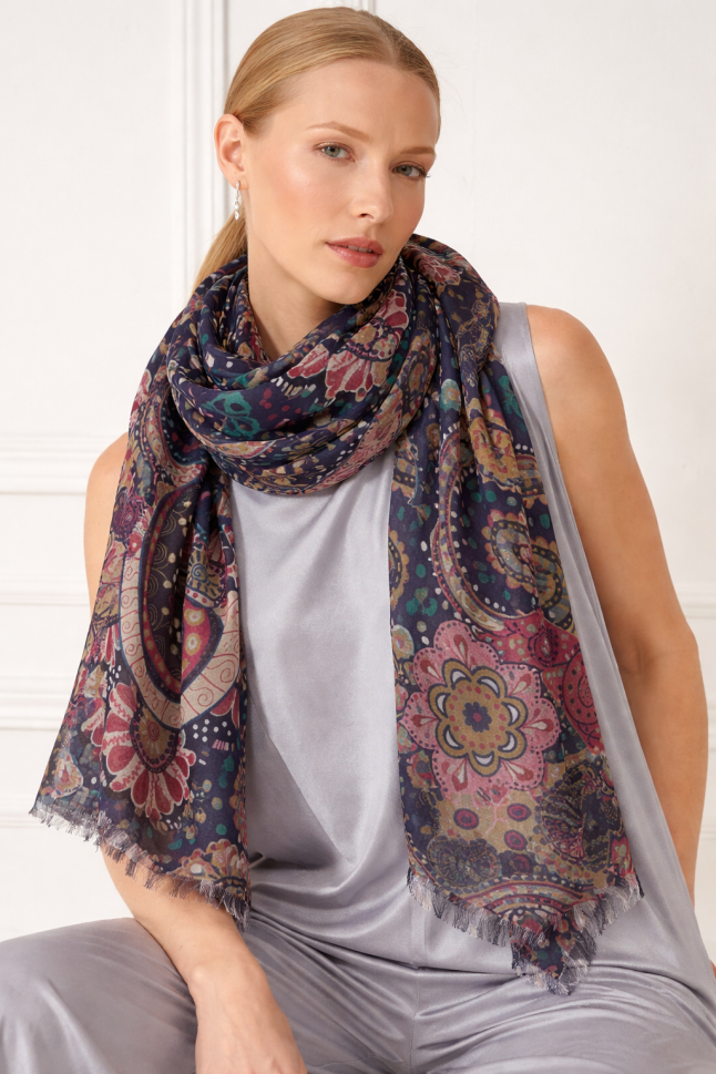 Eșarfă mare din viscoză de bambus cu motiv ornamental multicolor, cu material moale și plăcut la atingere. Ușoară și confortabilă la purtare, nu este voluminoasă și permite diferite moduri de combinare.
